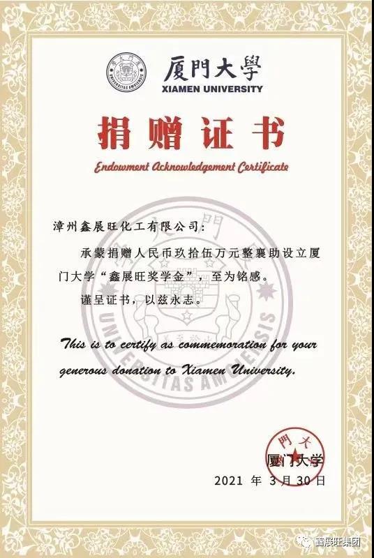 值此廈門大學(xué)百年慶典到來(lái)之際,廈門大學(xué)特邀鑫展旺集團(tuán)董事長(zhǎng)謝平展先生參加廈門大學(xué)舉辦的“建校100周年慶;顒(dòng)”暨“獎(jiǎng)學(xué)金捐贈(zèng)儀式”。