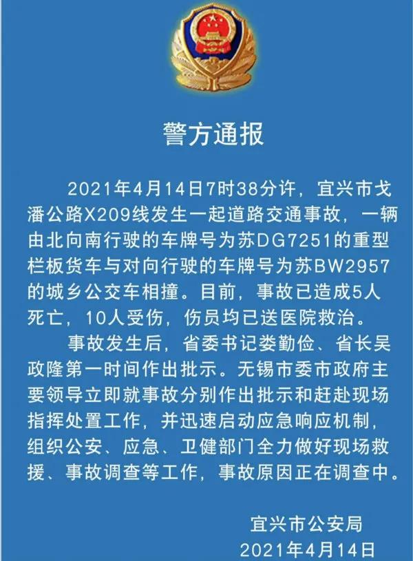 沈海高速大貨車與大客車相撞致11死事故才過去沒多久,4月14日,江蘇發(fā)生一起慘痛事故,一公交車與半掛車相撞,導致5死10傷!愿逝者安息! 據(jù)新華網(wǎng)消息,從江蘇省應急管理廳獲悉,14日上午7時45分,江蘇省宜興市徐舍鎮(zhèn)往楊港鎮(zhèn)方向一輛中巴車與貨車相撞,截至目前導致5死10傷。 據(jù)央視新聞報道稱,事故發(fā)生時公交車與貨車迎面撞上,貨車部件直插公交車內,車內狼藉一片。傷員已被送到宜興當?shù)蒯t(yī)院救治。目前事故原因正進一步調查中。 關于事故最新通報消息來了: 據(jù)江蘇省宜興市公安局官方微信消息,4月14日7時38分許,宜興市戈潘公路X209線發(fā)生一起道路交通事故,一輛由北向南行駛的車牌號為蘇DG7251的重型欄板貨車與對向行駛的車牌號為蘇BW2957的城鄉(xiāng)公交車相撞。 目前,事故已造成5人死亡,10人傷,傷員均已送醫(yī)院救治。