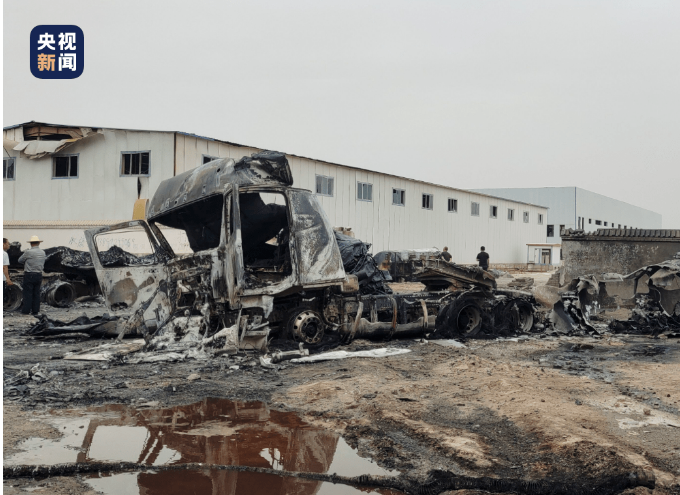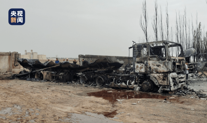 總臺記者已到達事故現(xiàn)場,事故發(fā)生于青海省格爾木市G109國道與東海路交叉口向北約200米處。現(xiàn)場火勢已經(jīng)撲滅,空氣中彌漫著刺鼻的味道,可以看到三輛殘缺不全的罐車殘骸,一旁瑞城工業(yè)園的側門也在爆炸中被炸毀。