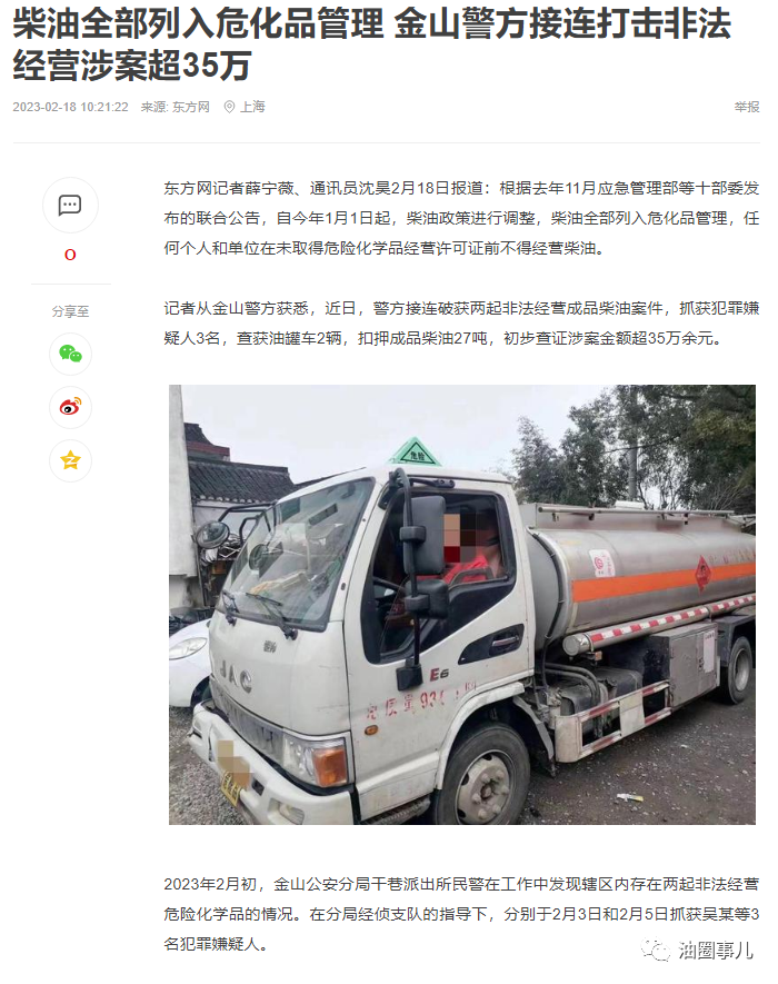 案例一:近日,長沙市天心區(qū)應(yīng)急管理局接到群眾舉報,在暮云街道蓮河村蓮河加油站正后面100米處一板房內(nèi),儲存了危險化學(xué)品。該局立即聯(lián)合組織公安、街道等部門上門核實,發(fā)現(xiàn)龔某某為節(jié)約成本,在自建板房油罐內(nèi)儲存2.88噸柴油,供自家車隊使用。臨邊就是中石化蓮河加油站,一旦出現(xiàn)泄漏事故,易造成人員傷害和環(huán)境傷害,存在重大的安全隱患。天心區(qū)應(yīng)急管理局當(dāng)即對危險化學(xué)品進(jìn)行了扣押,消除安全隱患。 目前,天心區(qū)應(yīng)急管理局已經(jīng)對龔某某立案調(diào)查,龔某某未將危險化學(xué)品儲存在專用倉庫內(nèi),違反了《危險化學(xué)品安全管理條例》相關(guān)規(guī)定,執(zhí)法人員依據(jù)《危險化學(xué)品安全管理條例》和《安全生產(chǎn)行政執(zhí)法與刑事司法銜接工作辦法》(應(yīng)急〔2019〕54 號)相關(guān)規(guī)定,對龔某某作出罰款60000元的行政處罰,并移交公安部門進(jìn)行行刑銜接。 案例二:3月3日下午,根據(jù)群眾舉報,長沙市開福區(qū)應(yīng)急管理局聯(lián)合青竹湖街道對湖南某公司開展危險化學(xué)品“打非治違”執(zhí)法檢查行動。該公司位于新港路80號,現(xiàn)場設(shè)置了地下儲油罐1個、加油機(jī)1臺。公司負(fù)責(zé)人表示,儲罐內(nèi)儲存的0號車用柴油主要用于公司內(nèi)部車輛加油使用。執(zhí)法人員檢查發(fā)現(xiàn)地下儲罐全部浸泡水中,銹蝕嚴(yán)重,且未采取任何安全防范措施,存在巨大安全隱患。 該公司涉嫌違反《危險化學(xué)品安全管理條例》第二十四條第一款“危險化學(xué)品應(yīng)當(dāng)儲存在專用倉庫、專用場地或者專用儲存室(以下統(tǒng) 稱專用倉庫)內(nèi),并由專人負(fù)責(zé)管理的規(guī)定”。執(zhí)法人員依法對該地下儲油罐進(jìn)行查封,扣押柴油4.6噸。目前案件正在進(jìn)一步調(diào)查中。2023年1月1日起,所有柴油列為《危險化學(xué)品目錄》,不再區(qū)分閃點(diǎn)。為打好安全生產(chǎn)攻堅仗,開福區(qū);療熁üべQ(mào)專委會深入推進(jìn)柴油專項整治工作,組織各街道、各部門全面摸排,特別是物流運(yùn)輸企業(yè)、渣土公司、攪拌站、建設(shè)工地、廢鐵站等用油量較大的單位,嚴(yán)禁違規(guī)設(shè)置露天罐、埋地罐等非法儲油設(shè)施;交警、交通部門將加大對非法改裝廂式貨車、面包車非法運(yùn)輸柴油的打擊力度;公安機(jī)關(guān)積極配合辦理行刑銜接案件。 案例三:2023年2月初,上海金山公安分局干巷派出所民警在工作中發(fā)現(xiàn)轄區(qū)內(nèi)存在兩起非法經(jīng)營危險化學(xué)品的情況。在分局經(jīng)偵支隊的指導(dǎo)下,分別于2月3日和2月5日抓獲吳某等3名犯罪嫌疑人。經(jīng)查,犯罪嫌疑人吳某等3人在已申報但還未取得危險化學(xué)品經(jīng)營許可證的情況下,長期從事柴油銷售,他們從正規(guī)渠道以“批發(fā)價”購入柴油,銷售的柴油主要用于工地施工設(shè)備以及農(nóng)場農(nóng)用機(jī)械等,至案發(fā)已非法銷售柴油50余噸,涉案金額超35萬元。 目前,犯罪嫌疑人吳某、尹某、艾某3人因涉嫌非法經(jīng)營罪被公安機(jī)關(guān)依法采取刑事強(qiáng)制措施,案件正在進(jìn)一步審理中。根據(jù)網(wǎng)絡(luò)上的政策解讀,柴油全部列入危化品管理后,將嚴(yán)厲打擊一些個人或企業(yè)利用內(nèi)部自用加油站的名義(比如物流公司內(nèi)部車輛加油)來打擦邊球進(jìn)行柴油對外經(jīng)營或貿(mào)易的行為,柴油納入危化品管理后,若無證經(jīng)營或儲存,將面臨刑法的危險作業(yè)罪、非法經(jīng)營罪的責(zé)任追究。此外,按照治安管理處罰法相關(guān)要求,對加油站對外銷售打桶或散裝柴油有可能更加嚴(yán)格,對于偷盜柴油的行為,處罰會更加嚴(yán)重。 ;方榻B 2022年11月7日,應(yīng)急管理部等10部門發(fā)布關(guān)于調(diào)整《危險化學(xué)品目錄(2015版)》的公告,將“1674柴油[閉杯閃點(diǎn)≤60℃]”調(diào)整為“1674柴油”,新規(guī)于2023年1月1日起施行。危險化學(xué)品,是指具有毒害、腐蝕、爆炸、燃燒、助燃等性質(zhì),對人體、設(shè)施、環(huán)境具有危害的劇毒化學(xué)品和其他化學(xué)品。一旦儲存運(yùn)輸不當(dāng),將會嚴(yán)重危害影響人民的生命安全和環(huán)境安全。危險化學(xué)品對于儲存場地有特殊的要求,應(yīng)與其他貨物分開儲存,儲存在專用倉庫內(nèi),并有專人負(fù)責(zé)管理。 溫馨提醒 企業(yè)在儲存和使用危險化學(xué)品時,要對危險化學(xué)品進(jìn)行管理,采取安全措施。危險化學(xué)品必須存放到專用倉庫,倉庫應(yīng)建在企業(yè)單位區(qū)域邊緣且保證有安全的防火間距。倉庫必須具有良好的通風(fēng)、隔熱條件,配備降溫、防潮、防汛、防雷等設(shè)施。倉庫的設(shè)施需要定期由專人檢查登記。倉庫內(nèi)應(yīng)安裝自動監(jiān)測和火災(zāi)報警系統(tǒng)。倉庫內(nèi)設(shè)施皆需要防爆功能,比如防爆燈、防爆風(fēng)扇、防爆開關(guān)等。庫房門應(yīng)采用外開式防火門,且有良好接地。倉庫地面需采用不燃燒且易洗的地坪。倉庫內(nèi)地坪需比外面地坪高至少0.2m,倉庫門口應(yīng)有斜坡。儲存易燃易爆危險化學(xué)品的場所應(yīng