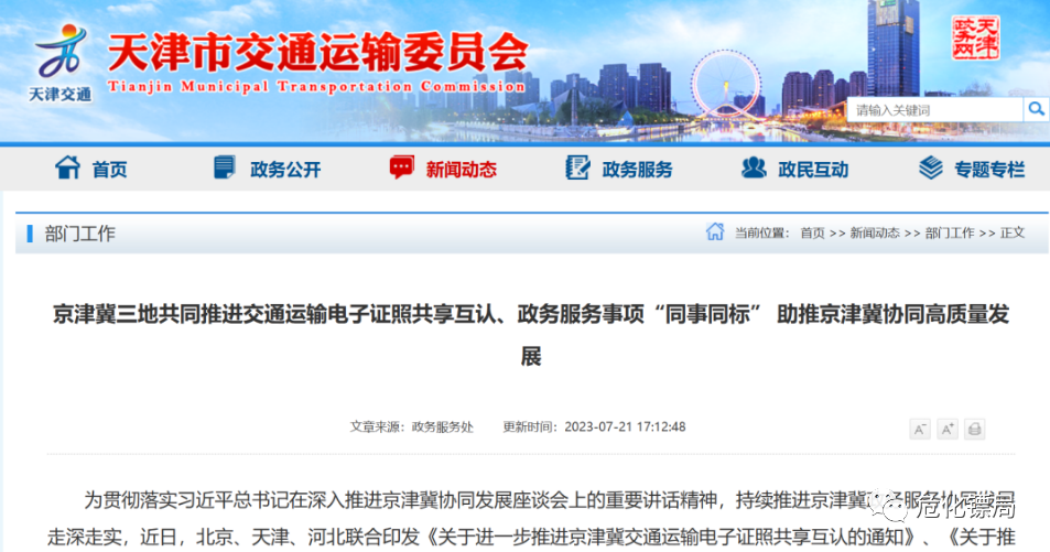 三地互認日前,北京市、天津市、河北省聯(lián)合印發(fā)《關(guān)于進一步推進京津冀交通運輸電子證照共享互認的通知》《關(guān)于推出京津冀交通運輸領(lǐng)域首批“同事同標”事項的通知》。目前,經(jīng)三地核發(fā)的五大類電子證照已實現(xiàn)三地互認:1、道路運輸經(jīng)營許可證2、道路運輸證3、道路運輸從業(yè)人員從業(yè)資格證4、道路危險貨物運輸許可證5、放射性物品道路運輸許可證