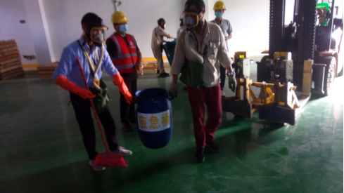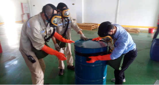 2、在應(yīng)急演練處置過程中,倉儲部作為應(yīng)急救援的主力軍,處置動作迅速、到位,對防毒面具的穿戴掌握熟練。