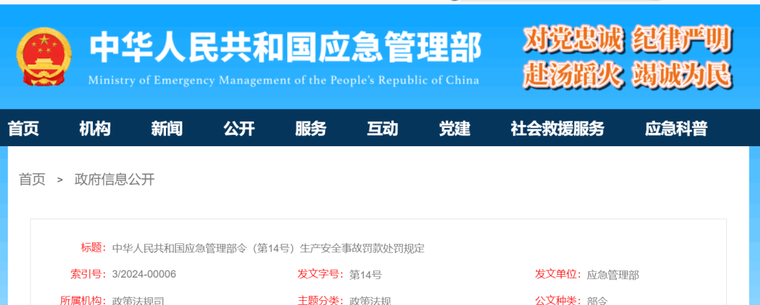 第14號(hào)生產(chǎn)安全事故罰款處罰規(guī)定中華人民共和國應(yīng)急管理部令第14號(hào)《生產(chǎn)安全事故罰款處罰規(guī)定》已經(jīng)2023年12月25日應(yīng)急管理部第32次部務(wù)會(huì)議審議通過,現(xiàn)予公布,自2024年3月1日起施行。部長 王祥喜2024年1月10日