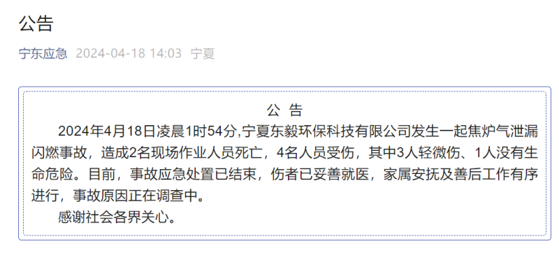 2024年4月18日凌晨1時54分,寧夏東毅環(huán)?萍加邢薰景l(fā)生一起焦?fàn)t氣泄漏閃燃事故,造成2名現(xiàn)場作業(yè)人員死亡,4名人員受傷,其中3人輕微傷、1人沒有生命危險。目前,事故應(yīng)急處置已結(jié)束,傷者已妥善就醫(yī),家屬安撫及善后工作有序進行,事故原因正在調(diào)查中。 據(jù)了解,寧夏東毅環(huán)?萍加邢薰臼菍氊S能源集團旗下的企業(yè)。該公司成立于2010年11月01日,位于寧夏寧東能源化工基地寶豐能源循環(huán)經(jīng)濟項目區(qū)。 2024年1月31日,寧夏寶豐能源集團股份有限公司精細化工廠曾發(fā)生一起爆燃事故,造成現(xiàn)場臨近的2名巡檢人員受輕傷。事故發(fā)生后,寶豐公司立即啟動應(yīng)急響應(yīng),14分鐘火情解除,事故得到有效處置,未發(fā)生次生災(zāi)害。