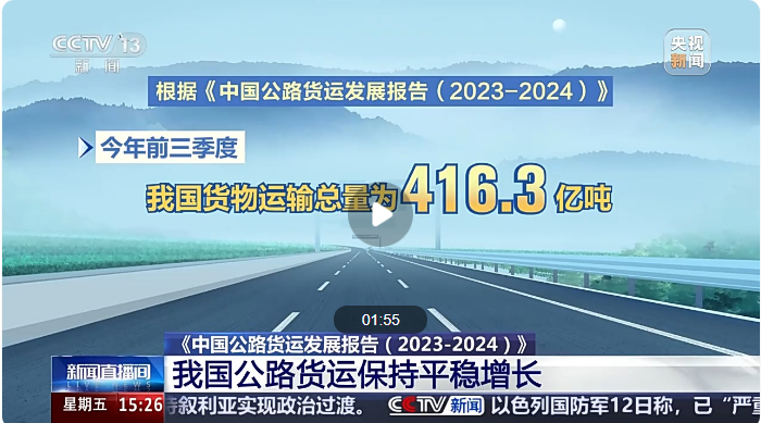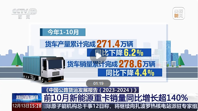 中國物流與采購聯(lián)合會今天(13日)公布《中國公路貨運發(fā)展報告(2023—2024)》。根據報告,受運輸結構調整影響,我國公路運輸占比雖有所下降,但依然是貨運市場的主體,公路貨運保持平穩(wěn)增長。 根據報告,今年前三季度,我國貨物運輸總量為416.3億噸,同比增長2.3%。從貨運結構來看,鐵路與水路運輸承擔的貨運量占比有所提升,公路運輸占比有所下降。前三季度公路貨運運輸量為306.6億噸,同比增長3.1%,占比超過73%,公路運輸仍然是貨運市場的主體。 中國物流與采購聯(lián)合會副會長 賀登才:公路運輸是我們整個物流體系中非常重要的一個環(huán)節(jié),它的優(yōu)勢是能夠點到點、門到門,靈活性強。調整運輸結構,有些環(huán)節(jié)離不開公路貨運。除了硬件方面使用新能源車、自動駕駛提高它的運輸效率外,現在通過平臺進行一些數字化改造,通過網絡貨運平臺及時溝通供需信息。 另外,報告指出,跨境公路運輸成為新增長點。2023年,我國跨境公路貨運市場規(guī)模約為4500億元,同比增長12%。隨著“一帶一路”建設深入推進,便利化協(xié)定實施范圍穩(wěn)步擴大,我國與蒙古國、俄羅斯及中亞各國的國際道路運輸進一步暢通,貨運量增長明顯,逐漸形成以邊境口岸為節(jié)點、覆蓋周邊國家邊境地區(qū)重要城市并向腹地不斷延伸的國際道路運輸網絡。 前10月新能源重卡銷量 同比增長超140% 根據《中國公路貨運發(fā)展報告(2023—2024)》,今年1—10月,我國貨車產銷量累計均超過270萬輛,其中新能源重卡銷量增長明顯,同比增長超過140%。 根據報告,2023年我國貨車保有量3359萬輛,同比增長1.2%。今年1—10月,貨車產銷量累計分別完成271.4萬輛和278.6萬輛,同比分別下降6.2%和4.4%。 與傳統(tǒng)重卡相比,新能源重卡展現出強大的市場活力。今年1—10月,新能源重卡累計銷量56760輛,同比增長超過140%,預計全年新能源重卡滲透率將突破8%。 中國物流與采購聯(lián)合會公路貨運分會秘書長 周志成:新能源重卡逆勢上漲,既有政策導向,也有成本的優(yōu)勢。第一,新能源相比傳統(tǒng)能源,價格優(yōu)勢比較明顯;第二,新能源電池價格下降,也降低了企業(yè)的購車成本。還有很多城市在推進新能源進城通行證的減免政策,也促進了企業(yè)新能源車的使用。