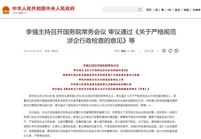 國(guó)務(wù)院總理李強(qiáng)12月23日主持召開(kāi)國(guó)務(wù)院常務(wù)會(huì)議,審議通過(guò)《關(guān)于嚴(yán)格規(guī)范涉企行政檢查的意見(jiàn)》,部署深化藥品醫(yī)療器械監(jiān)管改革促進(jìn)醫(yī)藥產(chǎn)業(yè)高質(zhì)量發(fā)展有關(guān)舉措,研究加強(qiáng)食品安全全鏈條監(jiān)管相關(guān)工作,聽(tīng)取建立促進(jìn)高質(zhì)量發(fā)展轉(zhuǎn)移支付激勵(lì)約束機(jī)制匯報(bào),審議通過(guò)《國(guó)務(wù)院關(guān)于規(guī)范中介機(jī)構(gòu)為公司公開(kāi)...